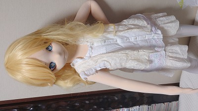 さくらドールズ リリー リリー普段着 金髪と白色コーデで夏らしい感じをイメージした 服は、ベスト、シャツ、スカート共にメゾピアノというブランドで統一してみた 実物は、結構黄色の強めなウイッグなのだが 写真にすると奇麗な金髪になっているという驚き